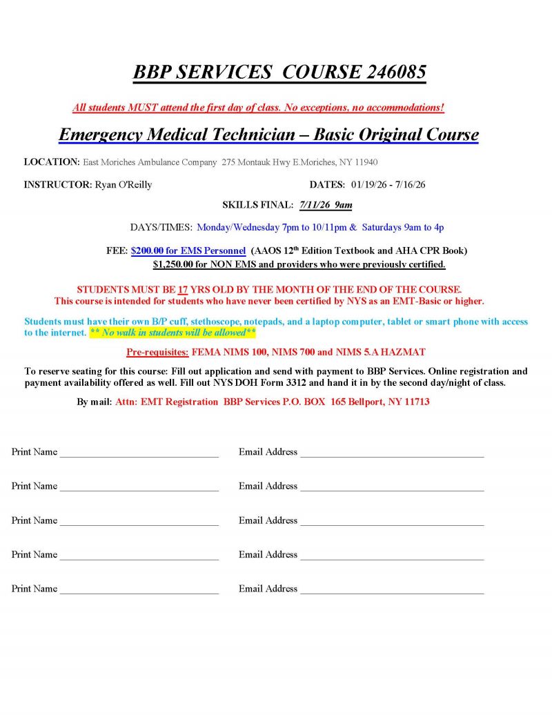 BBP Services - EMT-Basic Original Course at East Moriches Ambulance Company